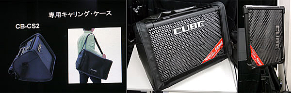 ▲専用キャリングケースもラインナップ(写真左)。写真中はケースに収めた状態。スピーカーの接地面に角度をつけることで、路上でのパフォーマンスや大きなステージでの演奏時に最適なモニタリングが可能。写真右はスタンドに取り付けた状態。