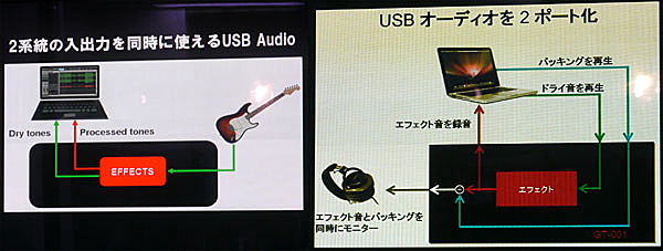 ▲GT-100 Ver2とGT-001ではエフェクトあり・なしの両方を同時録音可能(写真左)。USBオーディオの2ポート化で、カンタンにリアンプ可能、より柔軟な制作環境が得られる(写真右)。