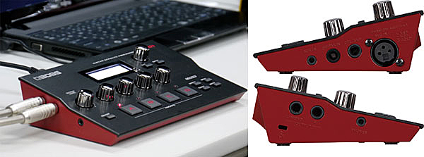▲GT-001は、ノートパソコンとともにデスクトップに置くのにぴったりなコンパクトなボディ(写真左)。左側面にはライン出力とヘッドフォン端子、右側面にはAUX入力、ギター入力、CTRL/EXP端子、そしてファンタム電源供給可能なマイク入力を装備(写真右)。USB端子は背面に。