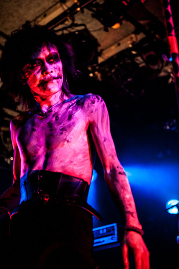 全公演メンバーがゾンビメイクで回るMERRYの全国ツアー<THE ZOMBIE ~地獄に堕ちた野郎ども~>が4月12日にスタートした。初日のHEAVEN’S ROCK熊谷 VJ-1公演は、不気味なゾンビメイクを施したメンバーがステージにゆっくり登場すると、このツアーのために人気曲「バイオレットハレンチ」をドロドロのアレンジに仕上げた「バイオレットゾンビ」で幕を開けた。さらに「ビニ本二丁目八千代館」、「スカル」などゾンビらしいダーク&ヘヴィなナンバーを立て続けに披露。メンバーがこだわったという真っ赤や真っ青の照明、裸電球の演出もおどろおどろしさを倍増させ、場内はまさに地獄絵図と化した。