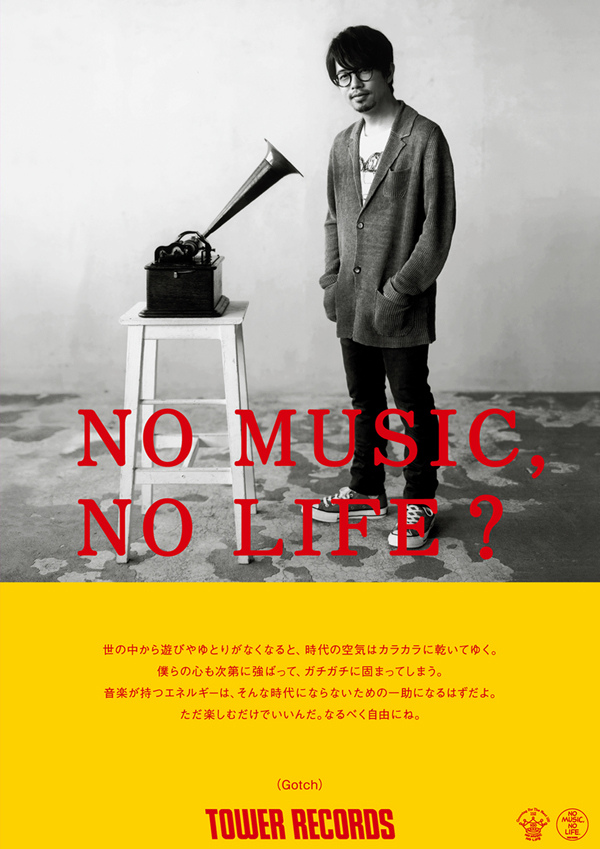 タワーレコードによる「NO MUSIC, NO LIFE?」ポスターの最新版にGotch(ASIAN KUNG-FU GENERATIONの後藤正文)が登場することが決定した。ポスターは4月18日(金)よりタワーレコードおよびTOWERmini全店の店頭にて順次掲出される。
