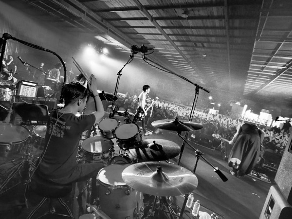この日の公演は、メンバーの強い希望で成立したもの。スケートボード施設として利用されている会場内にステージを特設して行なわれたライブは熱気に包まれた。