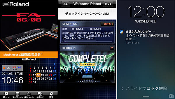 ▲画面左から「きせかえカレンダー ローランド・スキン」、「チェックイン・キャンペーン」イメージ、プッシュ通知のイメージ。
