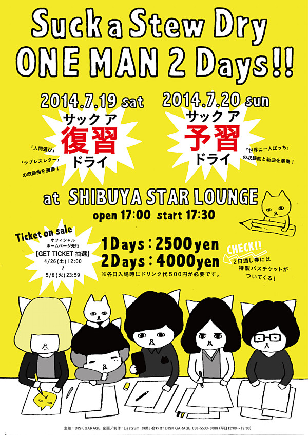 メンバーのシノヤマコウセイ(Vo)は、ワンマンについて「この度、Suck a Stew Dryが2daysワンマンという無謀な(と言うほどでもない)イベントを開催することになりました。今までの曲からこれからの曲まで、全曲やりますので、良かったら最後まで楽しんで頂きたいです。良くなかったら、いいです。よろしくお願いします。」とコメントを寄せている。