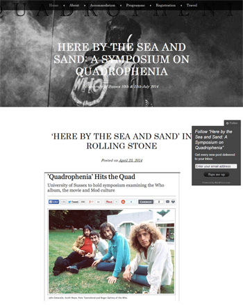 英国ブライトンで起きたモッズ対ロッカーズの乱闘事件から50年経つのを機に、ブライトン近郊にあるサセックス大学が、モッズとこの暴動を取り上げたザ・フーのアルバム『Quadrophenia(四重人格)』と映画『さらば青春の光』を研究するシンポジウム<HERE BY THE SEA AND SAND: A SYMPOSIUM ON QUADROPHENIA>を開く。