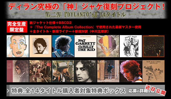 4月23日には、1970年『セルフ・ポートレイト』から1979年『スロー・トレイン・カミング』まで1970年代に発表された14タイトルが、当時のLPを完全再現した紙ジャケット仕様で発売となった。なかでも1973年発表『ディラン』と『ビリー・ザ・キッド』、1976年発表『激しい雨』、1978年発表『武道館』は、今回が初紙ジャケ化、初リマスターとなるものだ。4/22付オリコン・デイリー・チャート(洋楽)では『ディラン』が4位、『激しい雨』6位、1978年発表『武道館』7位と、約40年前の作品がTOP10に3タイトル・チャート・インする快挙を成し遂げている。