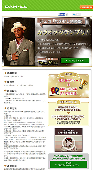 4月23日発売のジェロの新曲「なきむし倶楽部」を課題曲としたカラオケグランプリがDAMでスタートした。