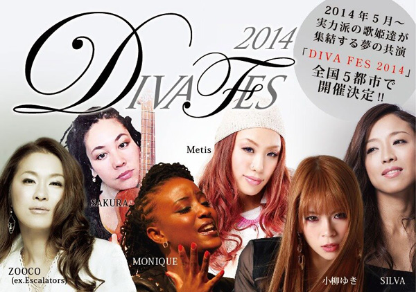 東京公演には、SILVA、小柳ゆき、SAKURA、MONIQUE、Metis、ZOOCO(ex.Escalators)といったラインアップが発表されている。今回、小柳ゆきのヒット曲「あなたのキスを数えましょう」を出演者全員で歌うという企画も用意されているようで、<DIVA FES 2014>ならではの様々な見どころが用意されているようだ。