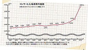 ▲コンサート入場者数は、基本的に右肩上がりの状態。グラフは、2013ライブ・エンタテインメント調査レポートより、コンサート入場者数の推移。2013年は2,070億円の売上見込。※2013年の入場者に関しては、ACPC(一般社団法人 コンサートプロモーターズ協会)調査からの速報値