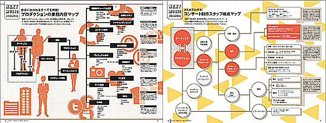 ▲音楽プロダクションの業務内容、コンサート制作スタッフの構成がひとめでわかるマップを掲載。