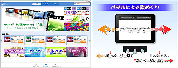 ▲アプリ内で楽譜の購入が可能(画面左)。幅広いジャンルを揃える。ヤマハ無線LANアダプター対応の電子ピアノ、MIDI対応の電子ピアノを接続すれば、ペダルによる譜めくりも可能。対応機種は、CLP-400/500シリーズ、CVP-600シリーズ、YDP-S51/162/142、P-255+LP-5A(今後発売される3本ペダル搭載の電子ピアノでも対応予定)。
