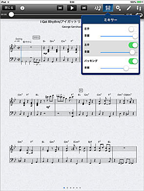 ▲ピアノパートやボーカル、伴奏をミュートすることでマイナスワン演奏やパートごとに試聴が可能。