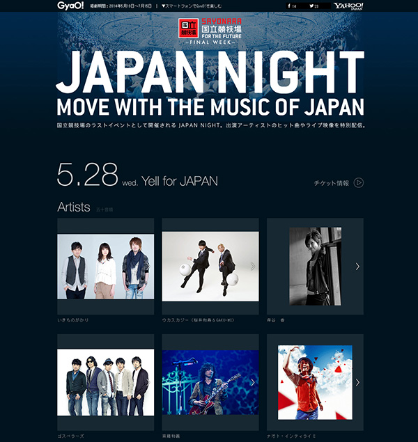 5月28日、29日と開催が迫った国立競技場最後の音楽イベント<JAPAN NIGHT>。これに関連した特設ページがGyaO!にオープンした。