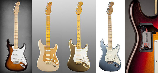 ▲左より:ストラト60周年アニバーサリーモデルの60th Anniversary American Vintage 1954 Stratocaster、60th Anniversary Classic Player ’50s Stratocaster、Squier 60th Anniversary Classic Vibe ’50 Stratocaster。配線の手間をかけずに瞬時にさまざまなワイヤリングへの変更を可能したパーソナリティ・カードを搭載したAmerican Deluxe Stratocaster Plus。右端はそのカードを搭載するボックス。