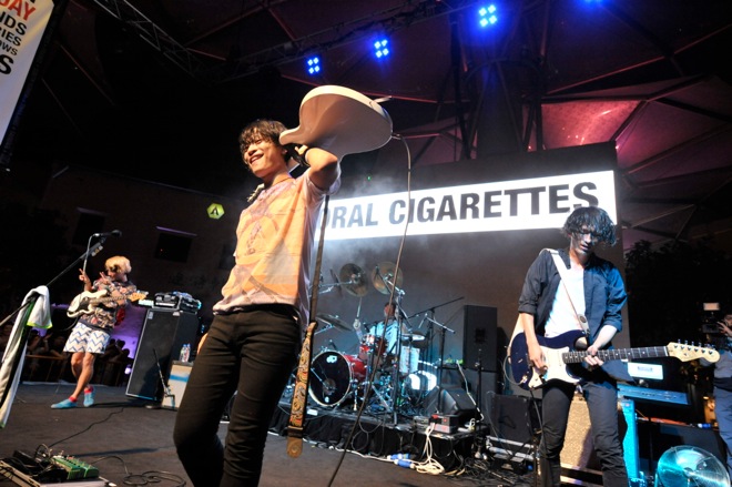 続いて登場するのは、2014年の“J-Rock代表”でもあるTHE ORAL CIGARETTES。ちなみに現地では、この転換タイミングで、ステージ後方の店舗の2Fに設置されていた関係者スペースから、ナオト・インティライミがふらりと顔を出して、観客たちの歓声に応えるというサプライズも。