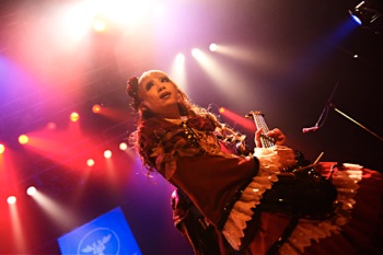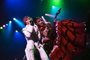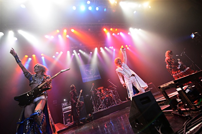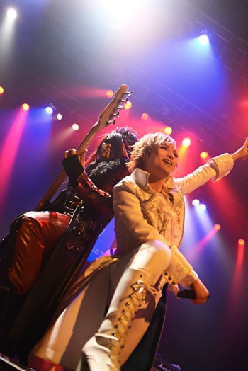 当日の午後3時、イベントのトップとしてJupiterがステージに登場したとき、冷ややかな雰囲気さえ会場に漂っていた。シンフォニックなオープニングSE「Introduction」が流れるなか、ボーカルのZINが、「準備はできているか!」と煽ったものの、反応は薄い。アウェイどころか場違いと言っていいかもしれない。それでもメンバーは「Blessing of the Future」からライブ本編へ突入した。これはメロディックなスピード・メタルとも呼べるナンバーで、きらびやかなコスチュームのTERU、貴婦人のドレス姿のHIZAKIが、それぞれテクニカルなギター・ソロで見せ場も作っていく。二人の後ろではベースのMASASHIとドラムのYUKIが疾走するメタリック・リズムを轟かせる。見た目こそヴィジュアル系だが、バンド・サウンドの核となっているのは明らかにヘヴィ・メタルである。しかも、あきれるぐらい演奏力は高い。
