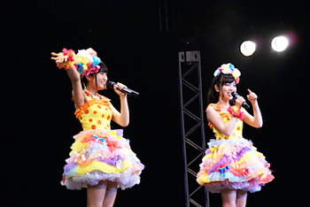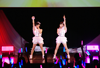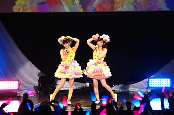 夜の部の1曲目は、もちろん4月9日に発売された「LUCKY DUCKY!!」からスタート。 MUSIC VIDEOでも着ていた黄色とオレンジの鮮やかな衣装で登場した2人による可愛らしい歌とダンスに、会場のファンも熱い声援を送る。2曲目の「PUPPY LOVE!!」と続けてライブ・ポップ・チューンで盛り上がったところで、ちょっと一息ついて最初のMCへ。客席を埋め尽くすピンクと青のサイリウムを改めて見渡した2人は「こんなに人数いると思わなかった!」(夏織)、「後ろのほうも見えてるよ!」(唯)と大喜びの様子を見せた。