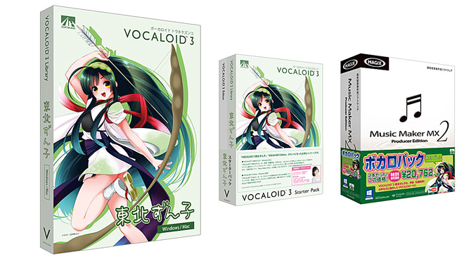ヤマハから発売されているボーカロイドで音楽制作をするための基本ソフトウェア「VOCALOID3 Editor」がセットになったお得なパッケージ「VOCALOID3 東北ずん子 スターターパック」も同時発売。そして、自動作曲機能もついた高性能音楽作成ソフト「Music Maker MX 2」とのセット「Music Maker MX2 ボカロパック 東北ずん子」も用意。これからVOCALOIDをはじめたいという人にも最適なセットとなっている。