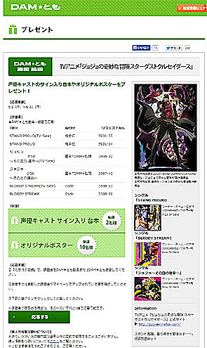 現在放送中のTVアニメ『ジョジョの奇妙な冒険スターダストクルセイダース』の声優キャストのサイン入り台本やオリジナルポスターが抽選で当たるプレゼント企画が、DAMで開催中だ。