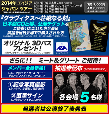 名古屋、大阪、東京公演の開場30分前より、各会場の入り口付近に用意されたスペースにてコンサートチケットと『グラヴィタス~荘厳なる刻』日本盤CDと帯を提示すると、特典の“ロジャー・ディーン3Dパス”とミート&グリート抽選券が配布される。その際に特典引換済の印として帯とチケット裏面にエイジアのロゴスタンプが押印されるそうだ。