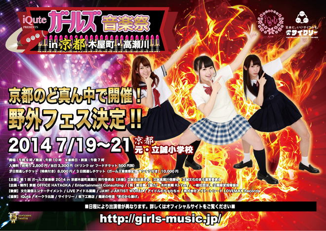 <ガールズ音楽祭>は、元・立誠小学校の野外グラウンドと校舎の一部を開放し、いくつもの特設会場が設営される。全長14メートルの巨大なバックスクリーン画が施された野外ステージをメインに、校舎内に「学園祭バンドステージ」「アイドル飛び入りステージ」「カラオケステージ」など、様々なステージが設けられ、巨大なガールズ・イベントになる模様だ。