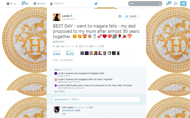 ロードは火曜日(6月17日)、この嬉しいニュースを絵文字いっぱいにTwitterで報告した。「最高の日よ -ナイアガラの滝へ行った- 30年近く一緒に過ごし、父が母へプロポーズした」