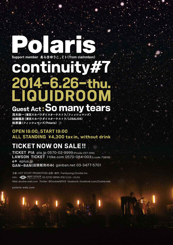6月26日(木)にPolarisが9年振りに贈るライブ・イベント<Polaris presents “continuity #7″>が恵比寿リキッドルームにて開催となる。Polarisのオフィシャル・サイトではイベント開催に向けてメンバーのコメントが公開されたほか、当日はPolarisとゲスト・アクトのSo many tearsのそれぞれのライブに加え、両バンドによるスペシャル・セッションが行われることが発表された。