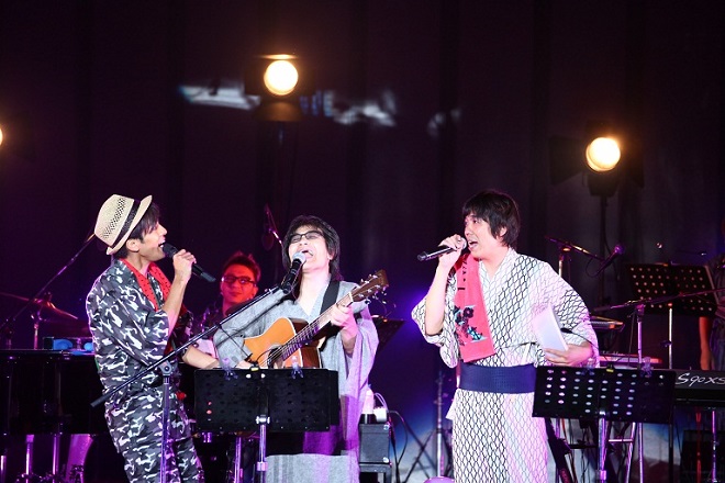 大橋がステージを去ると交代で登場したのが2人目のゲスト、スターダストレビューの根本要。サプライズでスイカを持って登場し、K本人も本気で驚く一幕も。K自身が、「このイベントをやると決めて、一番最初に浮かんだ人」と語る根本とともに歌ったのはKが生まれた年1983年にリリースされたスターダストレビューの楽曲「トワイライト・アヴェニュー」。続いて、根本をイメージして作ったという、Kの想いが詰まった楽曲「My Piano」を2人で披露。そのハーモニーに野音がしっとりとした空気に包まれる中、ステージには再び大橋卓弥が登場。K、根本要、大橋卓弥の3人で演奏されたのはスリー・ドッグ・ナイトの「Joy To The World」。誰もが1度は聴いたことがある名曲に会場は大合唱に包まれた。