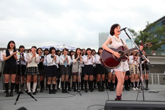 「ちっぽけな愛の歌」をしっかりと聞かせたあと、まだまだ“フレッシュなMC”を挟んで、この日のメイン企画に。フリーライブの観客動員2万人突破を記念して、大原櫻子と歌いたい(隊)の制服女子50人がステージへ。