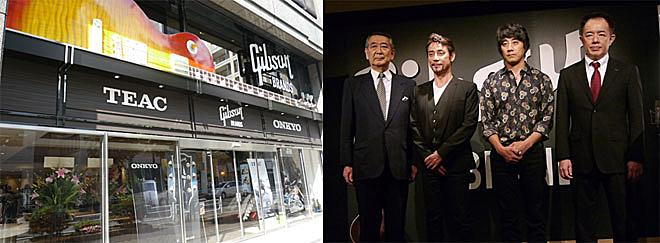 ▲レスポールの巨大レプリカが設置されたショールーム外観(左)と、発表会に登場したオンキヨーの中野宏氏、MCを務めたクリス・ペプラー、スペシャルゲストの山崎まさよし、ティアックの英祐治氏。