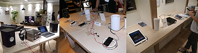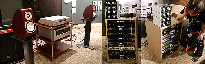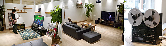 ▲「ロックスミス2014」体験コーナー(左)、ホームシアターシステム(中)など、リビングを想定した環境を提案するスペース。右の写真はカウンターにあったティアックのオープンリールレコーダー。