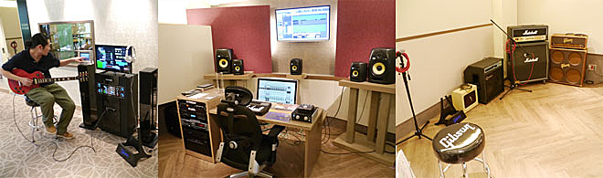 ▲本物のエレキギターを接続して楽しめるJOYSOUNDのカラオケ機器(左)の奥に見えるのがSOUND ROOM。録音・音楽製作環境を完備、アンプを使ったギターレコーディングももちろんOK(中、右)。