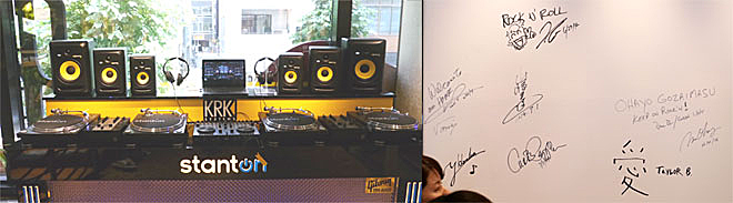 ▲2階の階段付近にはStantonのDJ機器によるブースも用意(左)。写真右はショールーム内の壁に書かれたアーティストのサイン。誰のサインがあるか、どこにあるかは行ってからのお楽しみ。