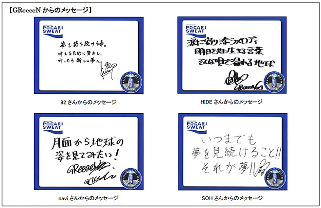 GReeeeNが制作するのは、2015年10月に打ち上げを予定する民間企業初の月面到達プロジェクト「LUNAR DREAM CAPSULE PROJECT(ルナ ドリーム カプセル プロジェクト)のテーマソング。世界中から寄せられる子ども達の夢を声にした楽曲は、月面を目指す夢のメッセージやポカリスエットと共に、タイムカプセル“LUNAR DREAM CAPSULE”に同梱される。