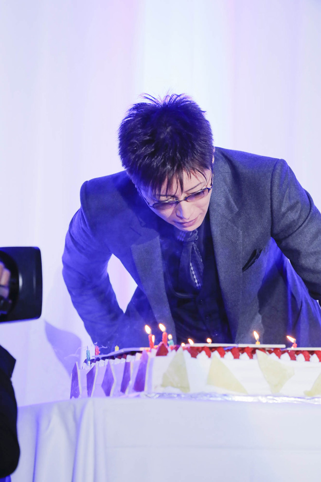 そして、最後は運ばれてきた特製バースデーケーキのロウソクを吹き消したGACKTが、みんなが歌うバースデーソングの歌声に耳を傾けながら、こっそり指でケーキの端っこを触って、その指をぺろっとなめて味見(微笑)。