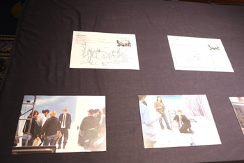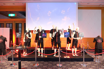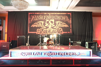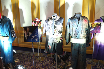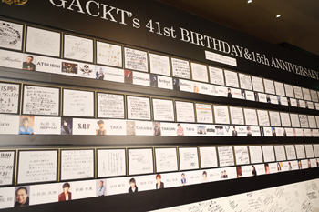 ホテルのイベント会場があるフロアに足を踏み入れ、まず目を奪われたのがロビーの壁一面に飾られた直筆のバースデーカード。そこにはYOSHIKI、HYDEを始め、LUNA SEAのSUGIZO、ゴールデンボンバーのキリショーこと鬼龍院翔からSKE48の松井珠理奈、さらには名立たる俳優陣から声優さんまで、誰もが知っている著名人の名前がズラリと並んでいる。さすが、一流芸能人。GACKTの人脈の広さに改めて驚かされる。ドアが開放された展示スペースをのぞくと、部屋の奥にはYELLOW FRIED CHICKENz時代のステージセットがそのまま再現。GAKCTが身につけていた数々のステージ衣装や、当時CDジャケットやPV撮影時に使っていた台本など、ここでしか見られないようなYFC時代のレアグッズたちもキレイにディスプレイされていた。