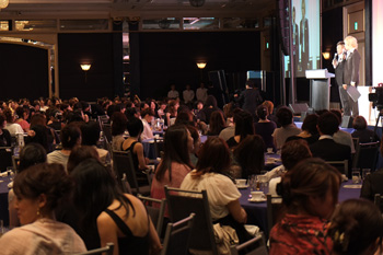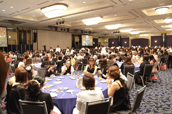 そして、この日のためにとびっきりドレスアップして集まってきたお客さんたちが、素晴らしいコース料理を食べ終えた頃、メイン会場には恒例の「ボレロ」が流れ出し、いよいよイベントがスタート。GACKTのライブや舞台ではおなじみのDuel Jewelばる(Dr)と古本新乃輔の2人がまず司会進行役としてステージに現れて、GACKTに縁のあるメンバーたち、Sato(B)、TAKUMI(G)、RYO(dancer)、MADOKA(dancer)、Duel Jewel隼人(Vo)、CHACHAMARU(G)、YOU(G)を次々と呼び込んでいく。こうしてメンバーが舞台に揃ったところで、始まったのは<ソロ15周年記念GACKTクイズ>。これは、出題されたクイズに対してGACKTがどんな回答を寄せたのかをメンバーが当てていくというコーナーだった。そのなかで、この日一番の盛り上がりを見せたのが「GACKTさんがこのなかで正直一番ぶさいくだなと思うメンバーは誰?」というどう考えても誰もが答えづらいだろうというクイズが出題されたとき。一様に困った表情を浮かべるメンバーたち。そこで新乃輔が「最近、おさがわせしている人ですよ(笑)」と際どいヒントを出すと、それにのっかっていって「YOUさん!」となんのお構いもなし正解を言い当ててしまったのがお調子者のRYO(笑)。ちなみに、GACKTがYOUを選んだ理由は「オンとオフの差があまりにも酷過ぎるから」だそう。