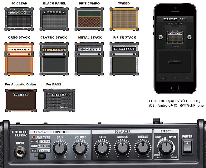 注目は、iOS/Android対応の専用アプリ「CUBE KIT」(App Store、Google Playで無料ダウンロード)を使用することで、内蔵のアンプタイプの入れ替えが可能なこと。あらかじめ用意された合計10種類から選択できる。さらに、ギター・サウンド・サウンドに空間的な広がりを加える、ディレイやリバーブ、音の広がりと厚みを付加する「コーラス」、さらには音質を調整する「イコライザー」など、ギターを演奏するのに必要な機能を凝縮している。