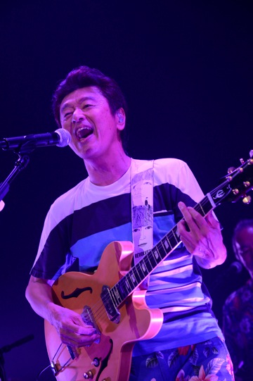 「古の風吹く社」の曲終わりに、このライブイベントのために集められたバンドメンバーがステージイン。斎藤誠(Gt)、琢磨仁(Ba)、小田原豊(Dr)、片山敦夫(Key)、角谷仁宣(Mp)そして原由子(Key)。桑田佳祐は、ひとりずつハイタッチで迎える。