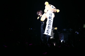 Crack6が得意とするR&Rナンバー「We are Black6」ではTENZIXXが「まだまだアゲていくぞ~!」と叫び、ハンドクラッピングで会場は一体に。ヘヴィメタル、ハードロック、ヒップホップ、パンク、ポップスと様々な音楽の要素が混在して爆発しているCrack6だが、共通項は突き抜けるダイナミズムとエンターテイメント精神に貫かれているということだろう。この日も、ジャムセッションコーナーの終わりでセンターに出たU6が持っていたはずのギターがリラックマになる早変わりで場内を沸かせ、なぜかクマの胸には10周年ではなく“10執念おめでとう”とのメッセージが。MCもなぜかブラジャーの話題になったり、全体的にツアーファイナルのプレッシャーなどまるで感じさせない自由な状態。トークも含め全てが予測不可能だ。