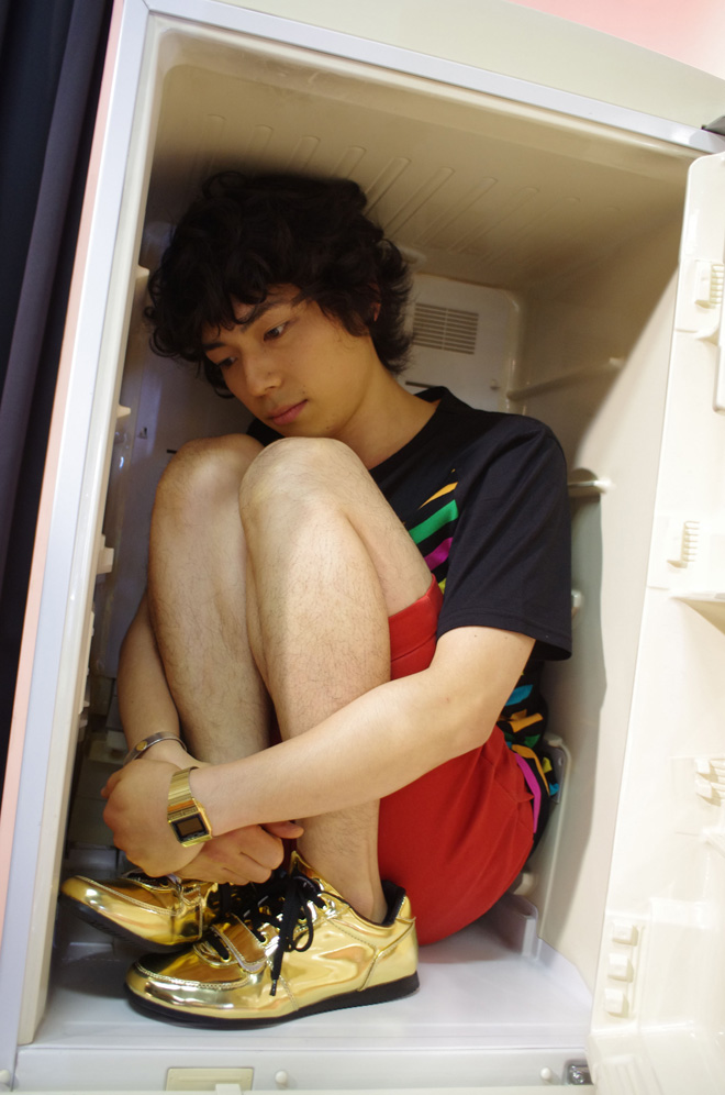 冷蔵庫の中!長い足を無理矢理畳んで…っていうか、クツ、派手!