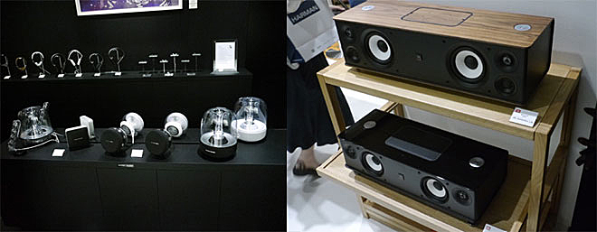 ▲余裕のある店内にはブランドごとに製品を展示。写真左はharman/kardonのスピーカー、ヘッドホン。右は参考出品のAirPlay、DLNA、Bluetooth対応スピーカーJBL Authentics L16とL8(未発売)。