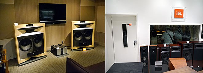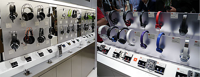 ▲ヘッドホン、イヤホンがずらり並び、自由に試聴可能。左はAKG、右はJBL。