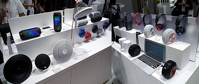 ▲スマートフォン用のモバイルバッテリー搭載Bluetooth対応スピーカー、PC向けのUSBスピーカー/デスクトップスピーカーもJBLから多数ラインナップ。