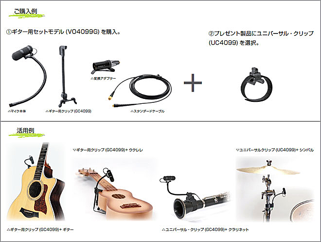 今回のキャンペーンでは、マイクロホン本体とマイククリップ1種類のセットモデルを購入した人に、もうひとつマイククリップをプレゼントする(ピアノ用セットモデルのみマイククリップを2個プレゼント)。