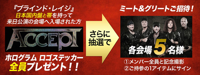 『ブラインド・レイジ』日本国内盤CDと付属の帯を持って11月から始まるジャパンツアー各会場に特設されたブースに行くと、日本限定で制作されたホログラム ロゴステッカーが全員にプレゼント、さらに当日の公演終了後に実施されるミート&グリートの参加抽選券も配布される。