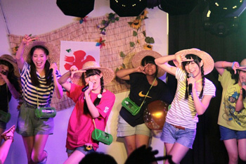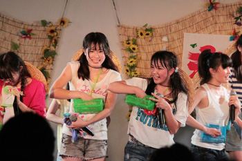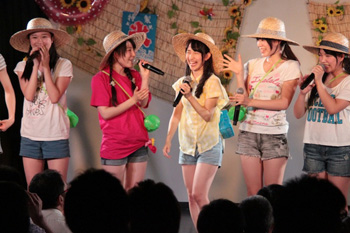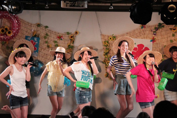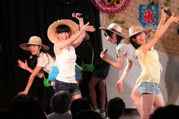 連続イベントの初日となった、7月25日(金)アキバ☆ソフマップ1号店で定期公演では、毎回テーマを変えた衣装でメンバーが登場。これまでも浴衣、ワンピース、ワイシャツ等、様々な衣装で公演を行なってきたが、この日のテーマは「夏休み」。麦わら帽子と虫かごを身につけたメンバーは、各々自分達がイメージする衣装でステージに登った。それぞれ、短パンにTシャツやタンクトップ等、子供の夏休みを想像させる装いで、普段のステージ衣装とは全く逆のベクトルの服装に身を包んだメンバーに会場に集まったファンも童心に戻ってイベントを楽しんでいた。