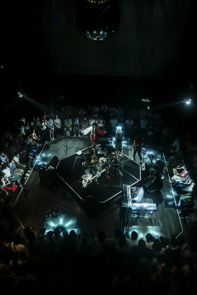 このイベントはアルバム購入者限定の応募招待制で行なわれたもの。会場となった渋谷WOMBには、楽器機材がフロアにセッティングされ、観客席はバンドを360度取り囲む形に配置されている。つまり、通常のステージは使わない円形型フロアライブ、というパスピエとして初の試みで実地された。