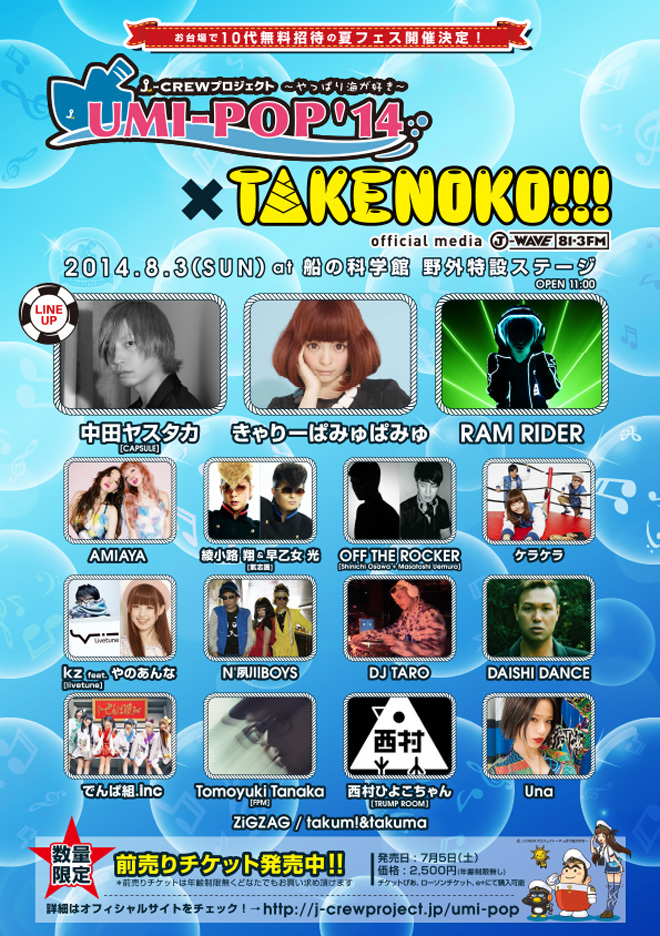 8月3日(日)にお台場船の科学館野外特設ステージで開催される、10代無料招待の夏フェス<UMI-POP’14×TAKENOKO!!!>の最終出演者とタイムテーブルが発表された。