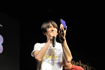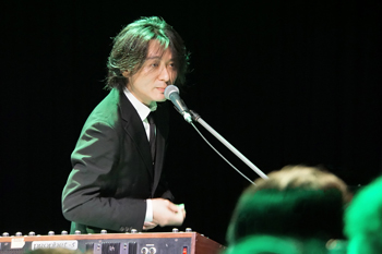 最初にビシッとスーツでキメたTECHNOBOYS PULCRAFT GREEN-FUNDの3人が舞台へあがり、大人気アニソンをリミックスした「もってけ!セーラふくEX.Motte[k]remix」を披露すると、朝イチにもかかわらずフロアはドッと沸騰。石川智久(Key)とフジムラトヲル(B)にサポートギター&ドラムを加えたバンドサウンド、サンプラーを操りながらマイクに向かう松井洋平のストレンジなエフェクトボイス、そして背後のモニターに次々浮かぶ文字とカラフルな照明のコラボに、場内にはサイケでミステリアスな空気が充満する。そこに結城アイラが加わって、歌詞の通りTECHNOBOYS PULCRAFT GREEN-FUND十八番のピッピコサウンドが炸裂する「ウィッチ☆アクティビティ」(「ウィッチクラフトワークス」エンディングテーマ)を歌い上げるが、そのパフォーマンスも本家のKMM団に勝るとも劣らないキュートさ加減だ。